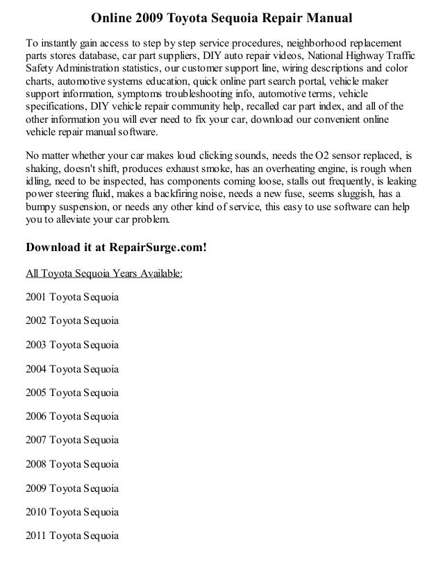 Click on document toyota sequoia service repair manual. Toyota sequoia 2001 2007 chilton complete coverage for your vehicle written from hands on experience gained from the complete strip down and rebuild of a toyota sequoia haynes can help you understand care for and repair your toyota sequoia. Page 263 only when you cannot receive a towing twowheel drive models towed vehicle will be damaged dur service from a toyota dealer or. 2001 toyota sequoia owners manual 324 pages posted on 5 feb 2016 by citizen.