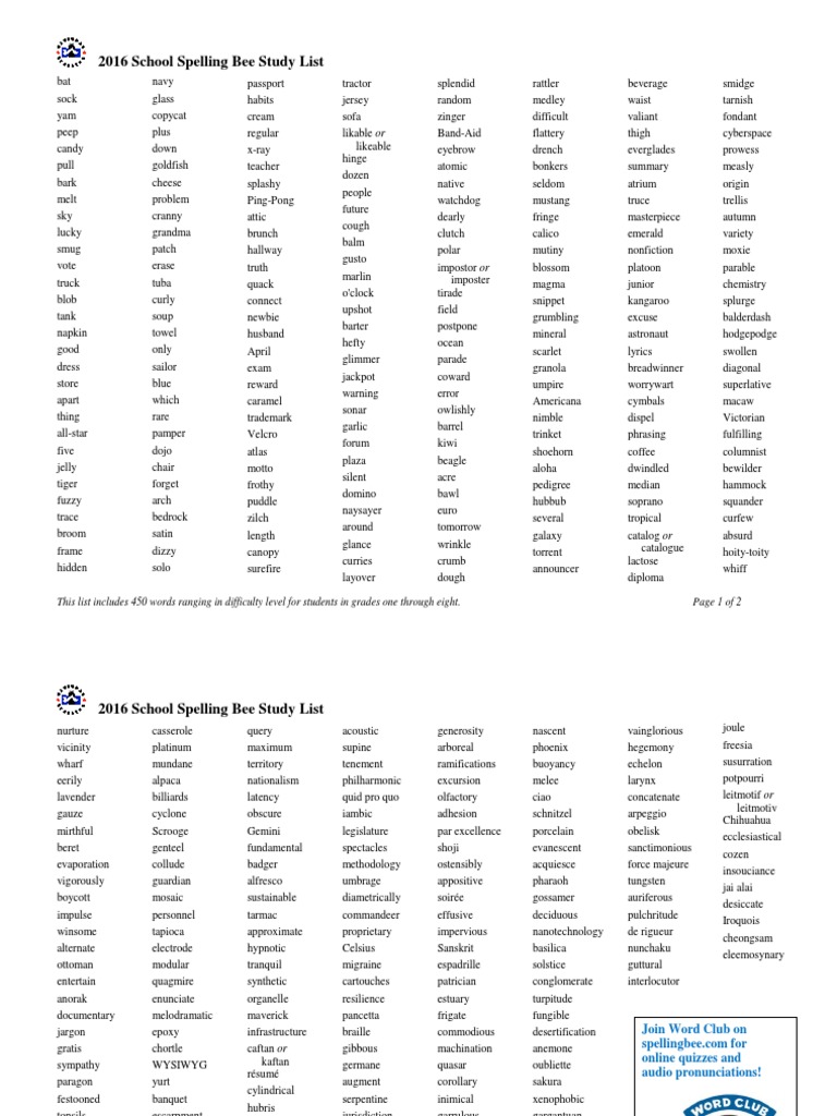 High School Spelling Bee Word List Pdf School Style