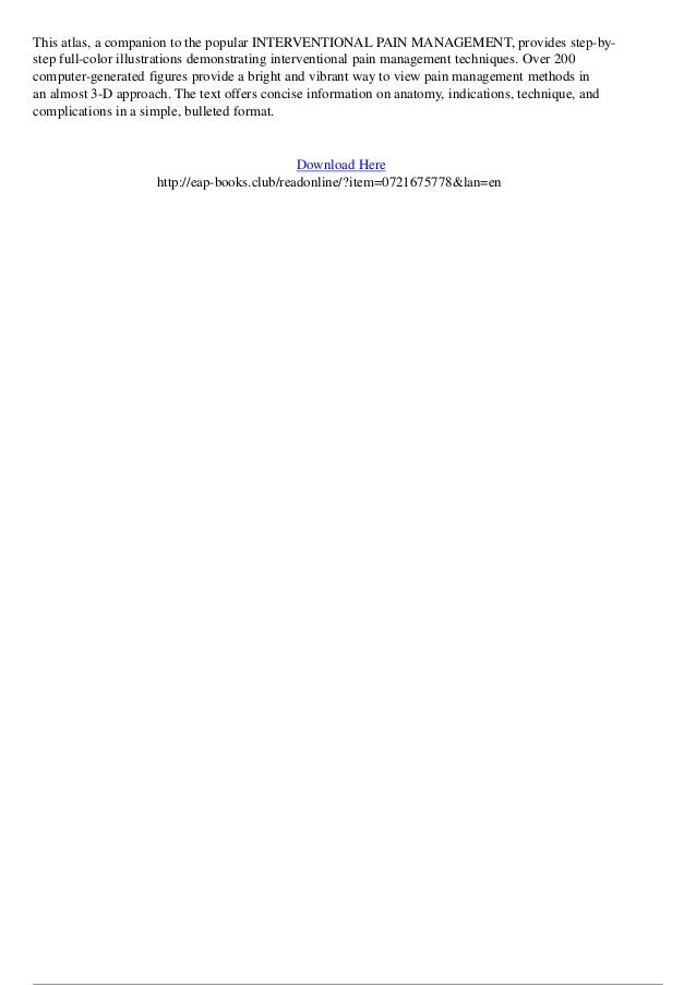 An essential resource for pain medicine clinicians at all levels of practice and training atlas of interventional pain management 5th edition is a comprehensive easy to follow guide to delivering safe accurate and cost effective relief for patients with acute and chronic pain. Atlas of interventional pain management book summary. An essential resource for pain medicine clinicians at all levels of practice and training atlas of interventional pain management 5th edition is a comprehensive easy to follow guide to delivering safe accurate and cost effective relief for patients with acute and chronic pain.