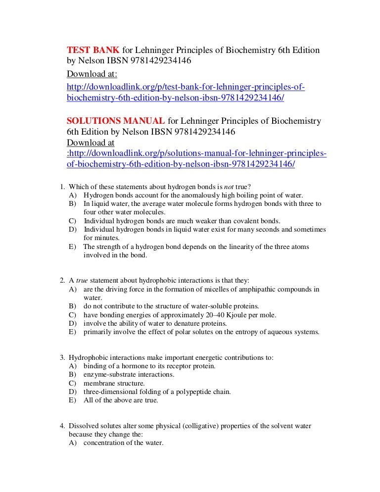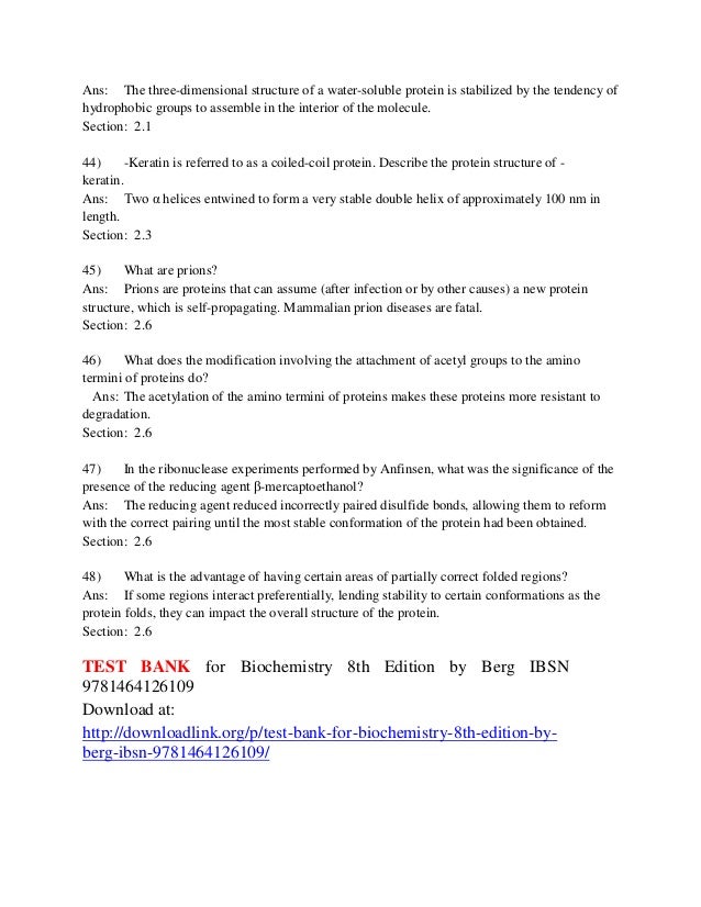 Test Bank For Biochemistry 7th Edition By Berg Tymoczko And Stryer